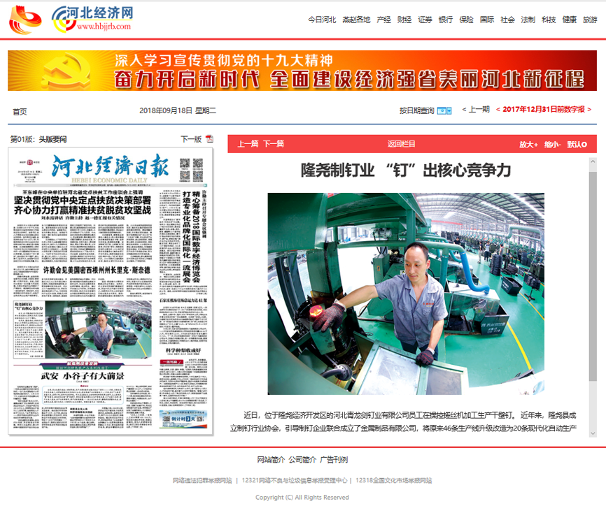 點(diǎn)贊!青龍劍釘業(yè)被《河北經(jīng)濟(jì)日報》頭版要聞