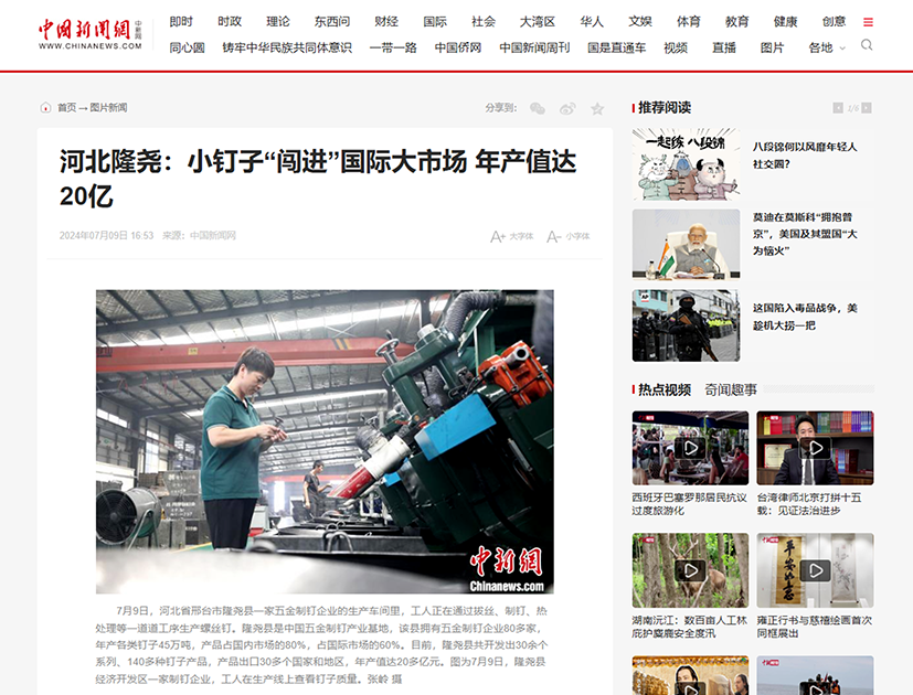 近日,中國新聞網(wǎng)記者走進河北隆堯青龍劍釘業(yè)有限公司,對制釘車間的生產(chǎn)工序及車間環(huán)境進行了解和拍攝。7月9日下午,青龍劍釘業(yè)榮登中國新聞網(wǎng)。