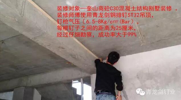 裝修工程隊(duì)使用青龍劍鋼排釘ST32對使用奎山商砼C30混凝土結(jié)構(gòu)的別墅進(jìn)行裝修吊頂 。(C30等級(jí)的混凝土幾乎可以適用于所有工業(yè)與民用建筑物、構(gòu)筑物的各種構(gòu)件)。