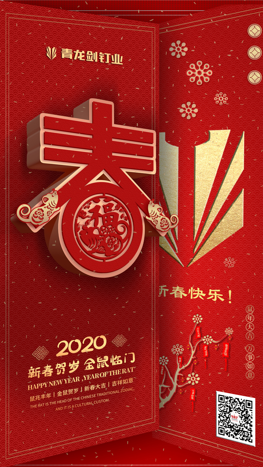 歲序常易,華章日新。當(dāng)時(shí)光穿越年輪,邁向2020新春佳節(jié),中華大地因納其盛世靈氣而芳澤毓秀,在這個(gè)充滿激情與期望的時(shí)刻,青龍劍釘業(yè)全體人員向所有關(guān)心關(guān)愛青龍劍公司發(fā)展的社會各界同仁、全國的經(jīng)銷商和用戶朋友們致以親切的節(jié)日問候和誠摯的新春祝福!